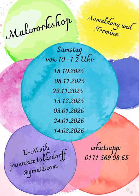 Gemeinsam erstellt jeder für sich sein eigenes Kunstwerk unter meiner Schritt für Schritt Anleitung mit praktischen Tips des Umgangs mit Pinsel und Farbe. Die Materialien werden gestellt.